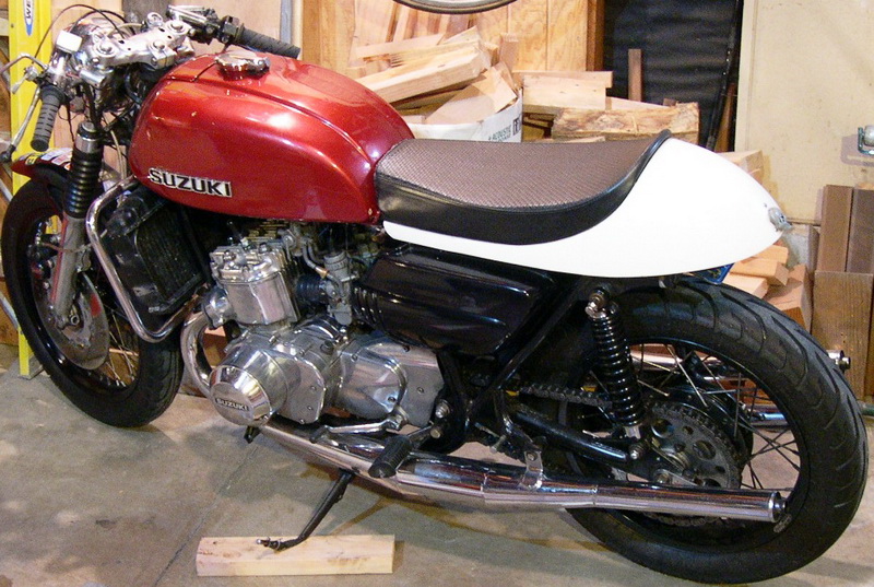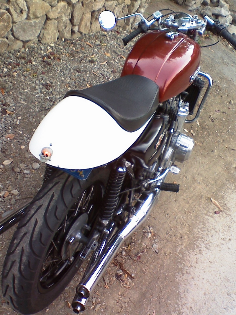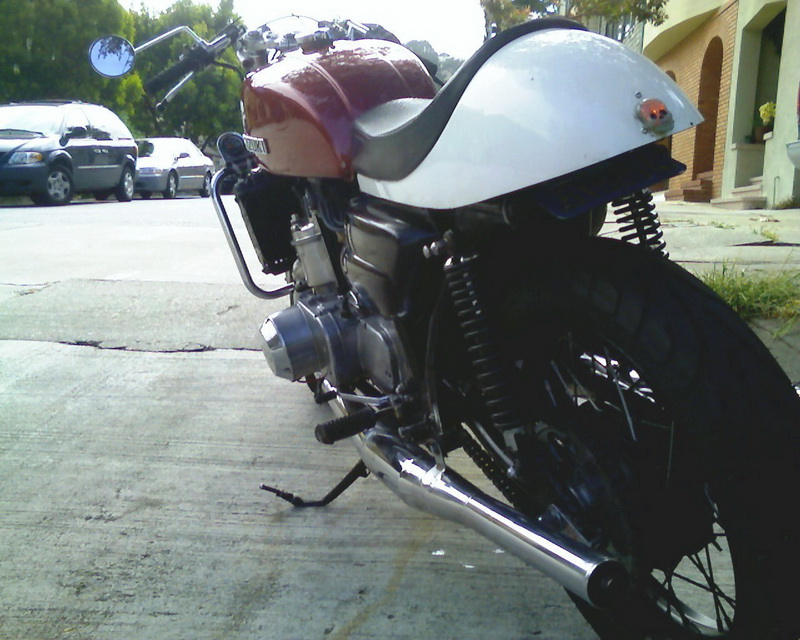 "Chambers" are probably Allspeeds, and are the one thing that really needs to be changed. They're better than stock, better than DG's, and way better than that 3-into-one silliness, but Swarbrick Racing in England or Jemco in Texas both make the real deal. Coolant temp gauge by Kragen Auto and speedo/odo is a Sigma bicycle computer. Tail lamp is a toy skull pin given out by the Peachy Puff Girls on Halloween at Lucky 13 in San Francisco years ago. Wheels are now both 18" front and rear and are Sun black-anodized rims on stainless spokes on the original hubs powder-coated. Laced by some dirt-track outfit south of San Francisco whose name escapes me... Swingarm straight-line bored and decent bushings pressed in. Seat/tailsection from Omar's. Carbs and jetting stock, except all mains 107.5.