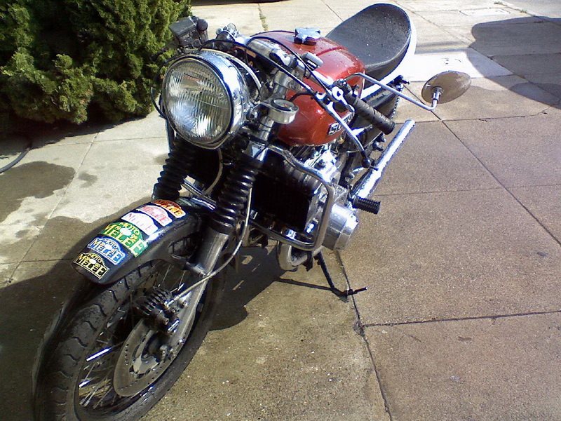 Attached are a few pics of my '73 Buffalo. I learned to ride (and crash!) on this bike, which I bought for $350.00 at an estate sale in 1994. It was covered in rust, dirt, and weeds. Since then, I've put 105,000 miles on it and have rebuilt everything. Rebuilt motor around 40,000 miles ago, and had a modern porting job done on the flow bench at ReplikaMaschinen in Scotts Valley, CA. Karl Engellener of Motorcycle Machining Specialties in Sacramento pressed up a new crank from NOS parts from Paul Miller in CT after having shaved the con rods to perfectly equal weight. Spun on the blocks, I measured less than .001" runout across the crank. The front brake rotors are full-floating drilled EBC cast-iron jobs, found collecting dust on a shelf at KC Engineering, SF, CA. Braided lines. Ignition is via Newtronics optical reader. Removed starter motor (first-kick starts nearly every time) and freeze-plugged the hole in the case.