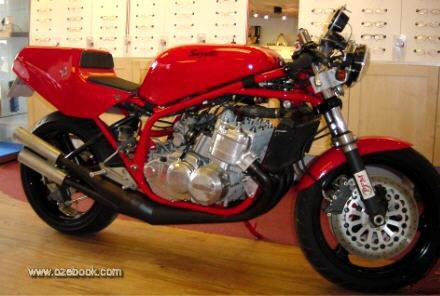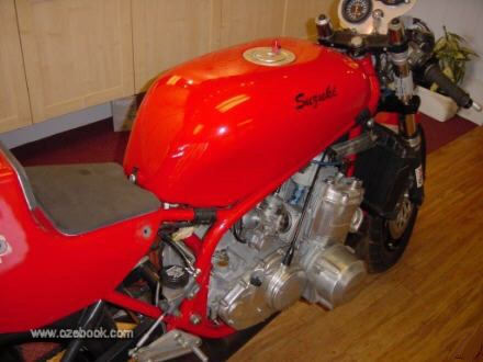 In essence, a GT750 Suzuki motor in a Saxon monoshock frame. The motor was rebuilt by Nova transmissions. They convert road engine GT750’s to the work’s specification race engines of the late 70’s. The motor was completely rebuilt to TR750 race spec, crank balanced, extensive porting, rebored with forged pistons fitted, squishes etc. Everything vapour blasted. Straight cut gears installed , even the crankcases were cut down to reduce width! They also fitted reed blocks in order to make it more tractable. Finally three enormous Mikuni carbs with powerjets(!!!) were fitted, usually only used in full race motors. The result- about 125BHP at the rear wheel. Barry Sheene’s bike made 115……….