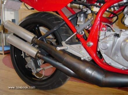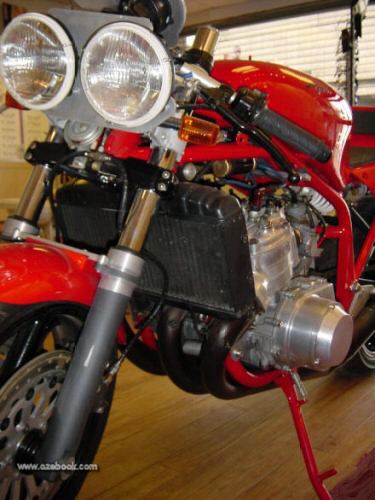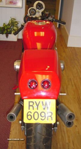 Exhausts are handmade by Peter Gibson, in blued steel. It has a Scitsu electronic revcounter and a gixer speedo. Most of the hoses, brake and coolant, are stainless.