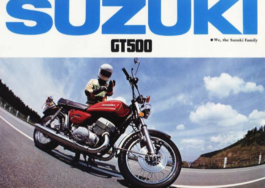 | GT 500A 1976 Maximum Speed: 168-176km/h (105-110mph) Maximum Horsepower: 44hp at 6,000rpm Maximum Torque: 5.40kg-m (39.0 lb-ft) at 5500 rpm Engine Type: 2-stroke, aluminum twin cylinder Piston Displacement: 492cc (30.0cu-in) Transmission: 5-speed, constant mesh Fuel Tank Capacity: 17l/4.5gal US Lubrication: Suzuki CCI Overall Length: 2195 mm (86.4 in) Overall Width: 880 mm (34.6 in) Overall Height: 1105 mm (43.5 in) Tires, Front: 3.25-19, 4PR Tires, Rear: 4.00-18 4PR Dry Weight: 395lbs |