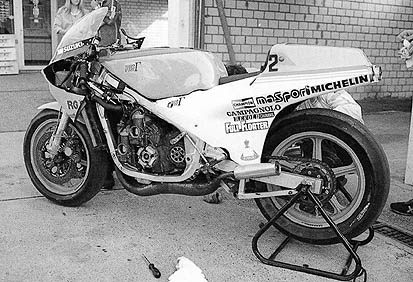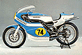 | 1974 XR14 The basic configuration-water cooled, 2-cycle, square four rotary disk valve of 500cc capacity |