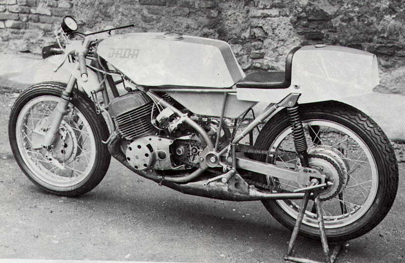 In 1972 Jack Findlay and Daniele Fontana built a new chassis for Jack's 500 Suzuki motor. It was lighter and stronger than the factory frame and more purpose built than his Seeley. They called the bike the Jada. The engine was well forward in the frame and the bike weighed only 100 kg, despite the heavy engine. Everything was done to save weight even down to titanium bolts and the use of circlips rather than nuts. This approach led to its downfall when the thin walled frame tubes broke at the Isle of Man.