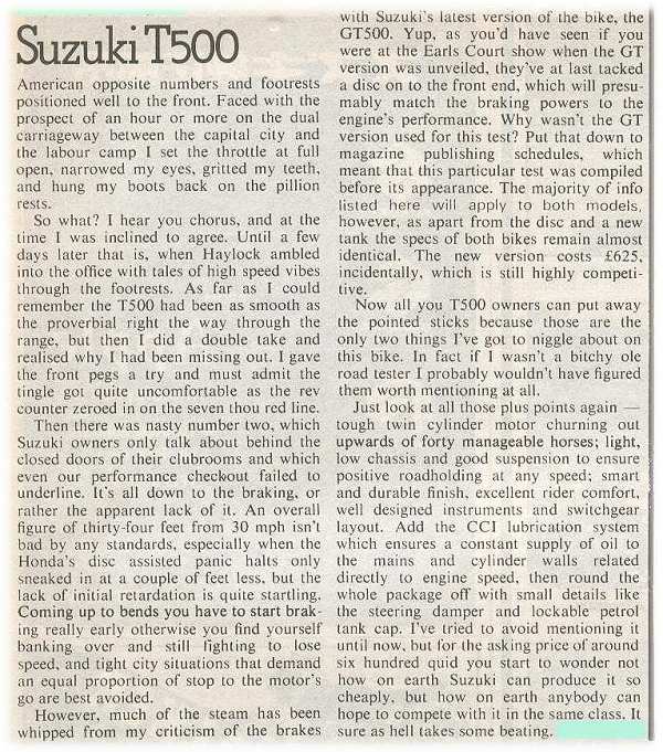 1975 Suzuki T500M Road Test Gazza’s scrapbook 1975 Suzuki T500M Road Test Related Articles Specifications – Suzuki T500/GT500 Suzuki T500J 1972 Owner’s Manual Click the following link to view: Suzuki T500J Owner’s Manual Crooks Suzuki T500 race review – 1971 Click here to read the review