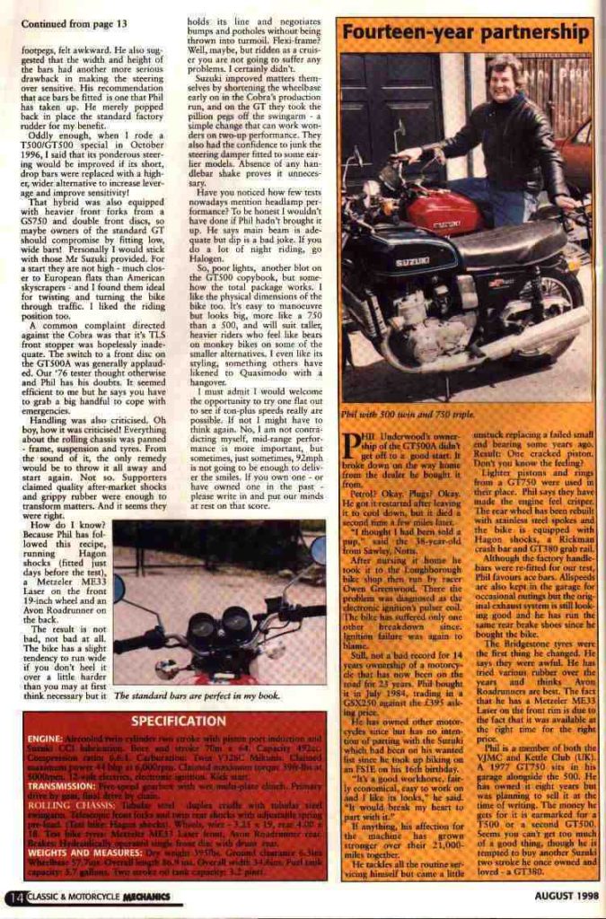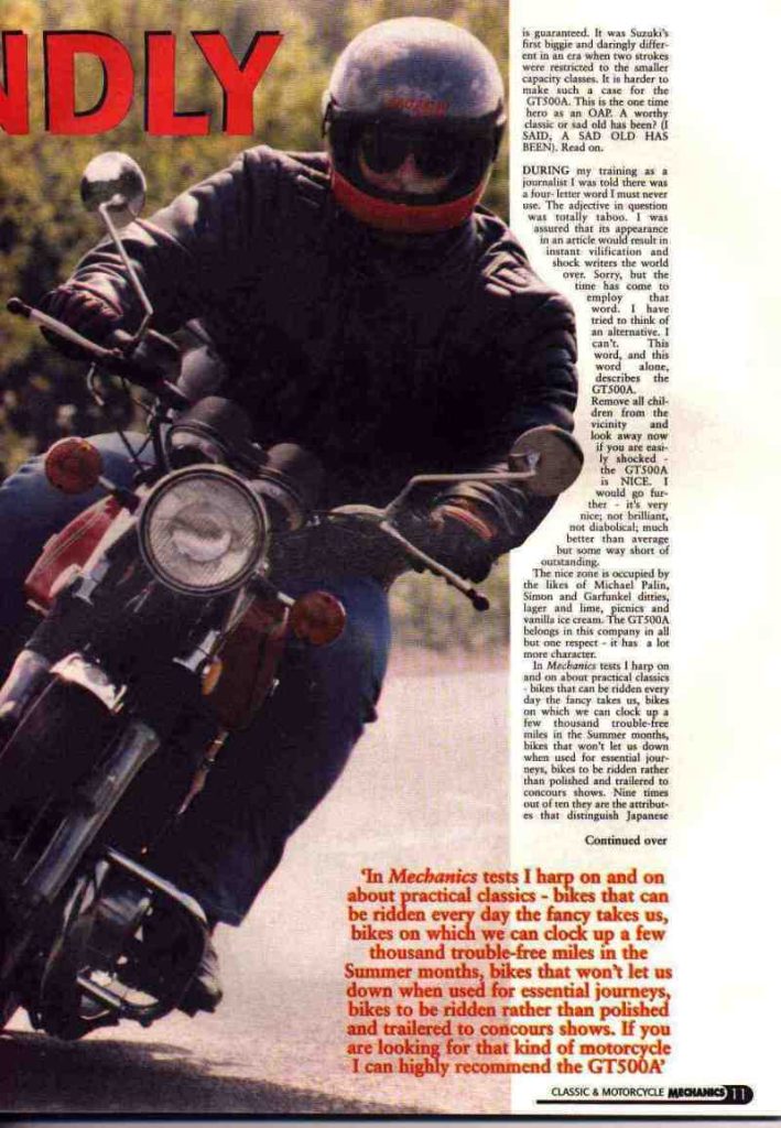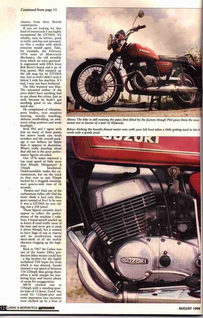 GT500A Road Test GT500 Road Test Road test report from Classic and Motorcycle Mechanics Aug 98 Related Articles Piston specifications – Suzuki T500/GT500 & GT750 Specifications – Suzuki T500/GT500 Suzuki T500/GT500 article – Old Bike Australia Like what you see…visit Old Bike Australia at https://www.oldbikemag.com.au