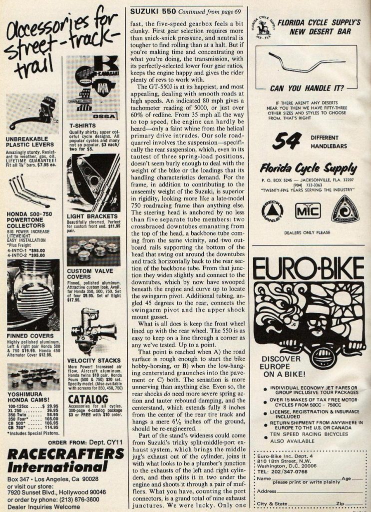 Suzuki GT550 test from 1972 Related Articles Front Forks – GT750M/GT550M/GT380M: Suzuki Service Bulletin 75/6 Suzuki GT550 – 1973 Road Test GT550 Road Test