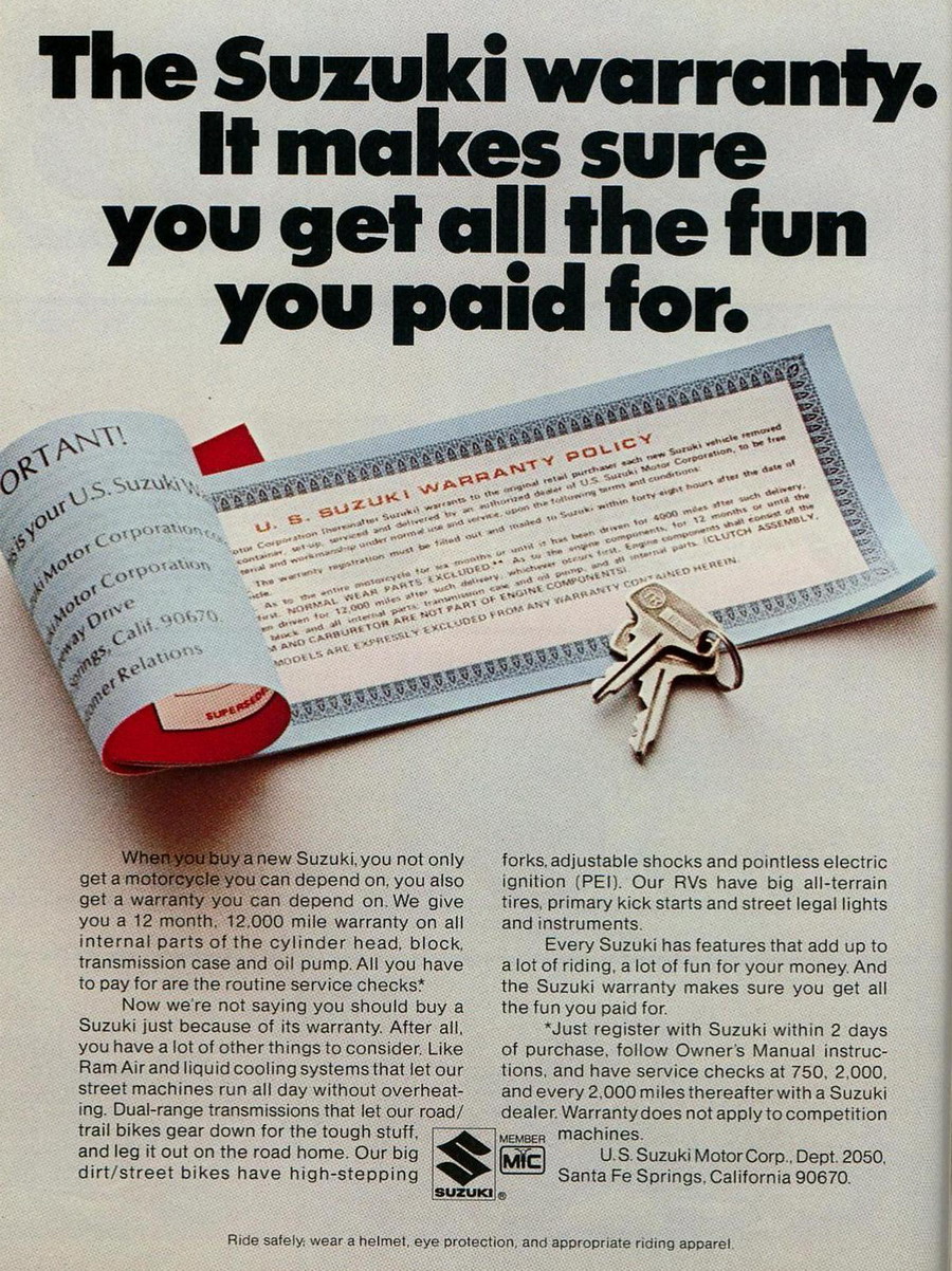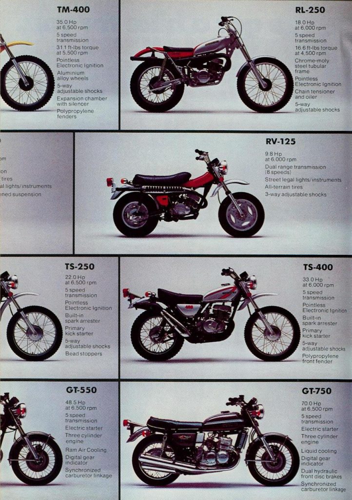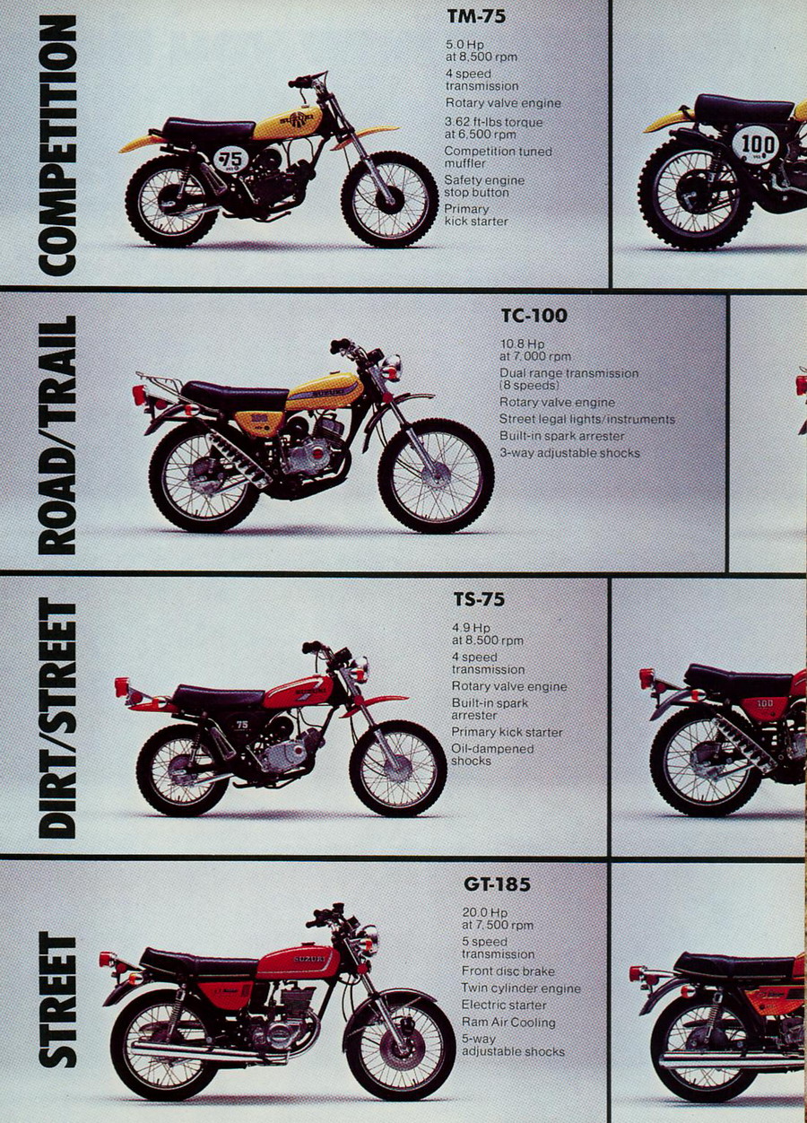 Suzuki lineup from 1975 Related Articles Crooks Suzuki T500 race review – 1971 Click here to read the review Suzuki GT750 – Modification to crankshaft – 1975 – Technical Bulletin Piston specifications – Suzuki T500/GT500 & GT750