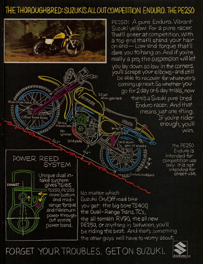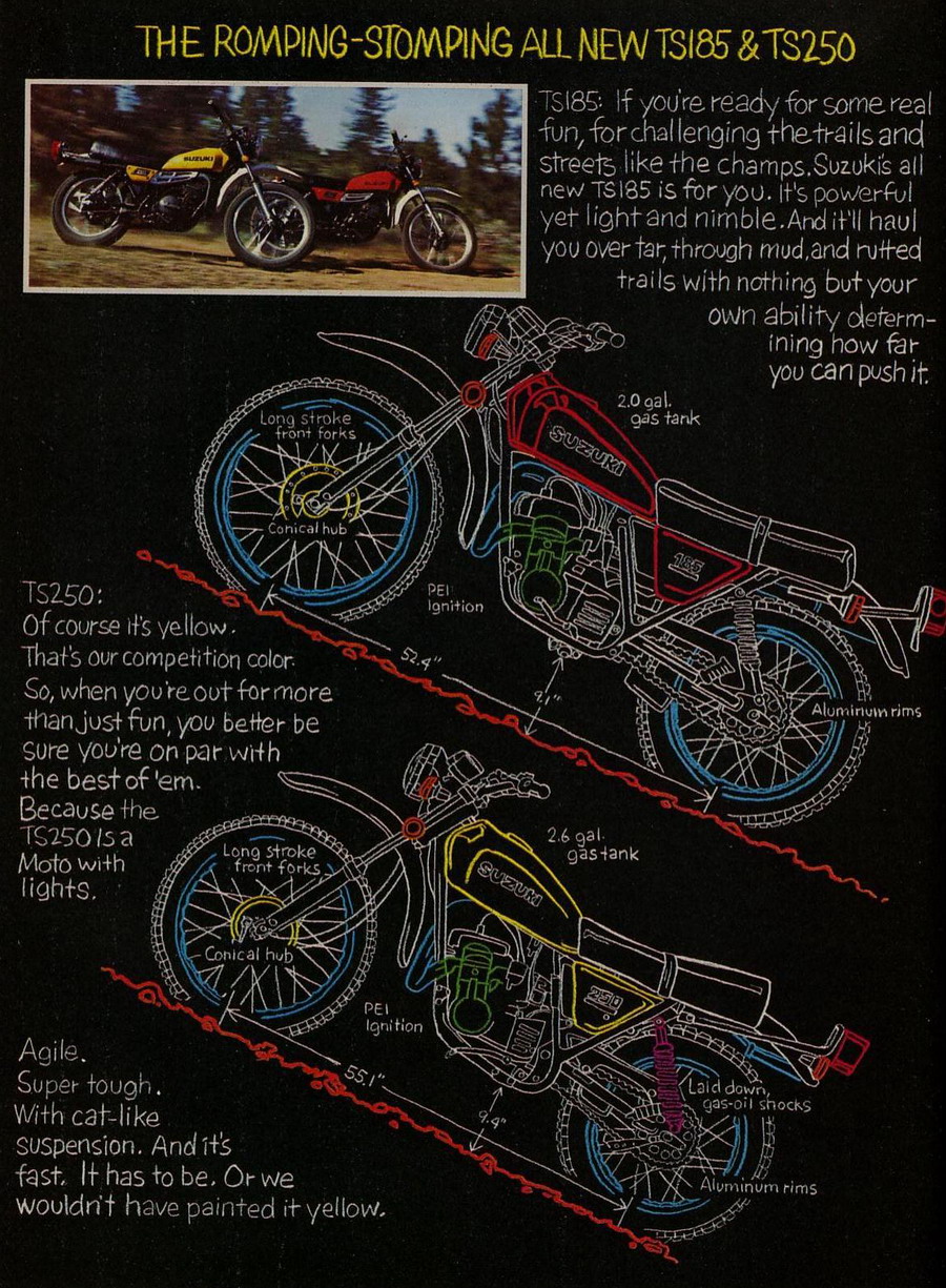 Suzuki RM, TS and PE lineup from advert for 1977 Related Articles Carburetor Specs: 1971-75 for Various Models – Suzuki Service Bulletins Suzuki TS line-up for 1972 Suzuki GT lineup from advert for 1977