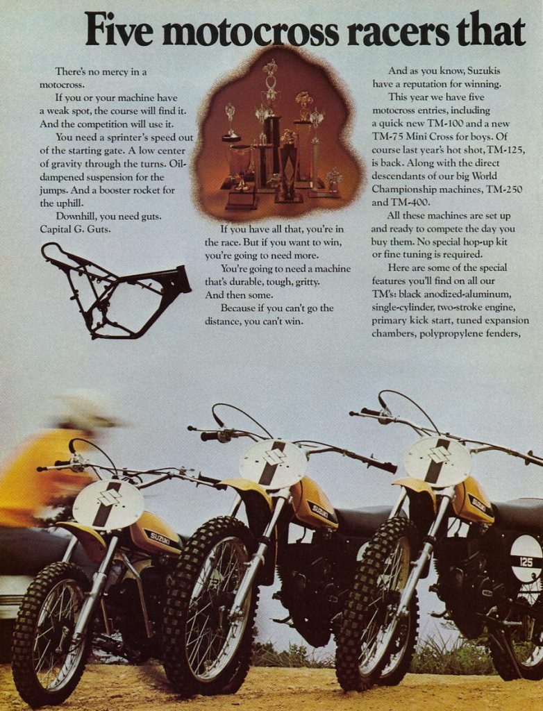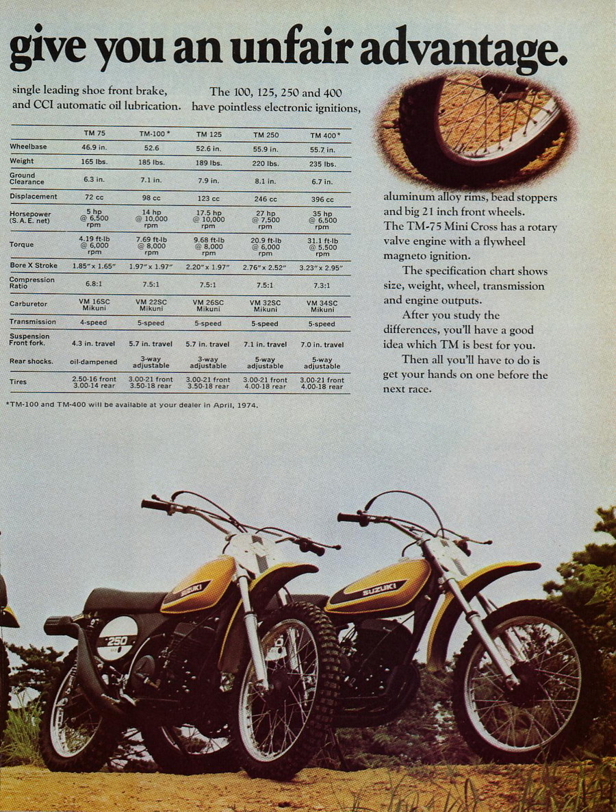 Suzuki TM lineup from 1974 Related Articles Suzuki TM line-up for 1972 Suzuki TM400 ad from 1972 1972 Suzuki line-up