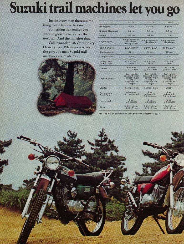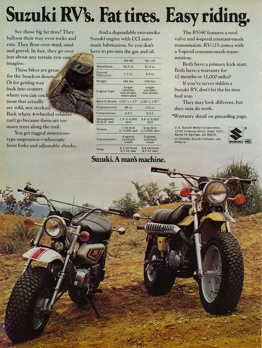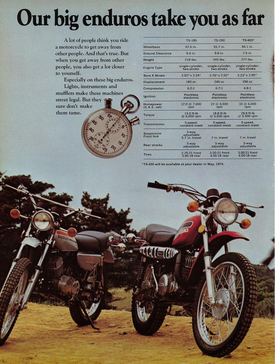Suzuki TS and RV lineup from 1974 Related Articles Carburetor Specs: 1971-75 for Various Models – Suzuki Service Bulletins Suzuki TS line-up for 1972 Suzuki RM, TS and PE lineup from advert for 1977