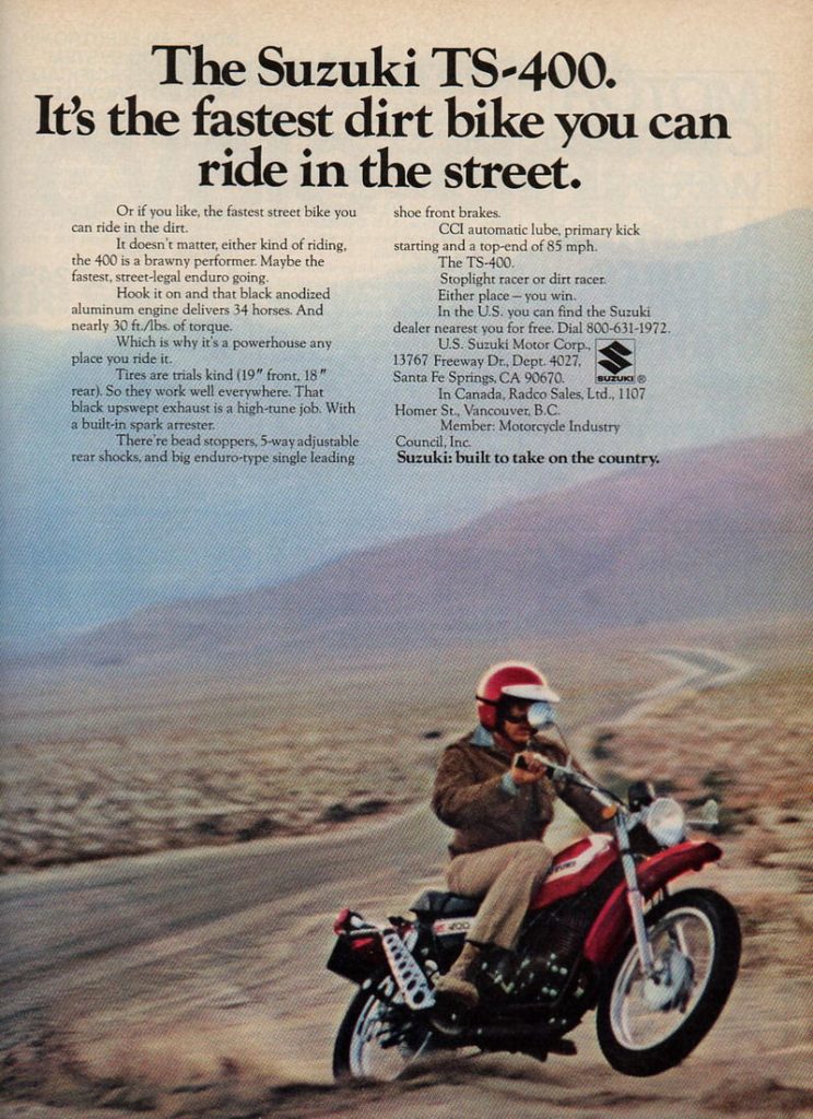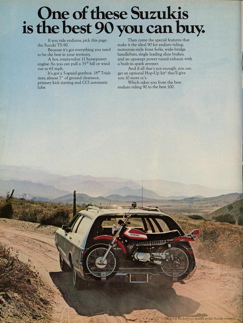 Suzuki TS line-up for 1972 Related Articles Carburetor Specs: 1971-75 for Various Models – Suzuki Service Bulletins Suzuki RM, TS and PE lineup from advert for 1977 Suzuki GT lineup from advert for 1977