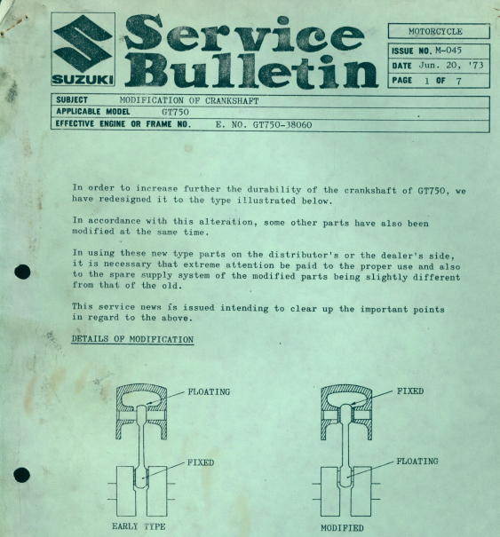 • Suzuki GT750 – Modification to crankshaft – 1975 – Technical Bulletin