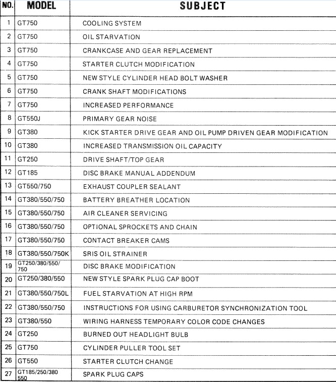 Suzuki Service Bulletins – GT750/550/380/500/250/185: 1972-77