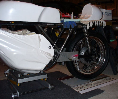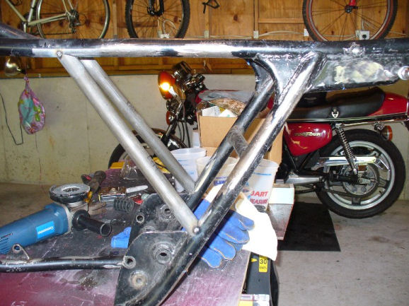 I cut and ground off about 5lbs of scrap metal in the form of center stand, side stand, fender mounts, side panel mounts, etc…