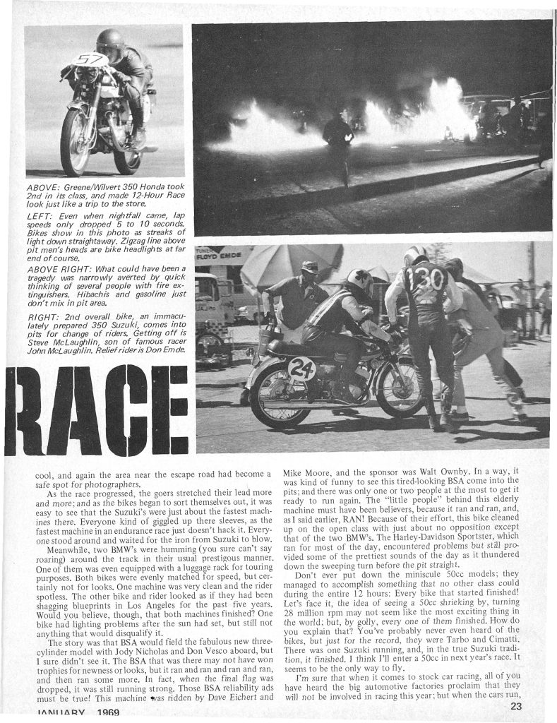 Suzuki sweeps the field in 1968 12 Hour Endurance Race – Willow Springs April 24, 2023 | No Comments | muzza | 9:03 am Ron Grant won the 500cc Class on a Cobra T500, Willie Hardin won the 100cc Class on a Suzuki Tags: 1968