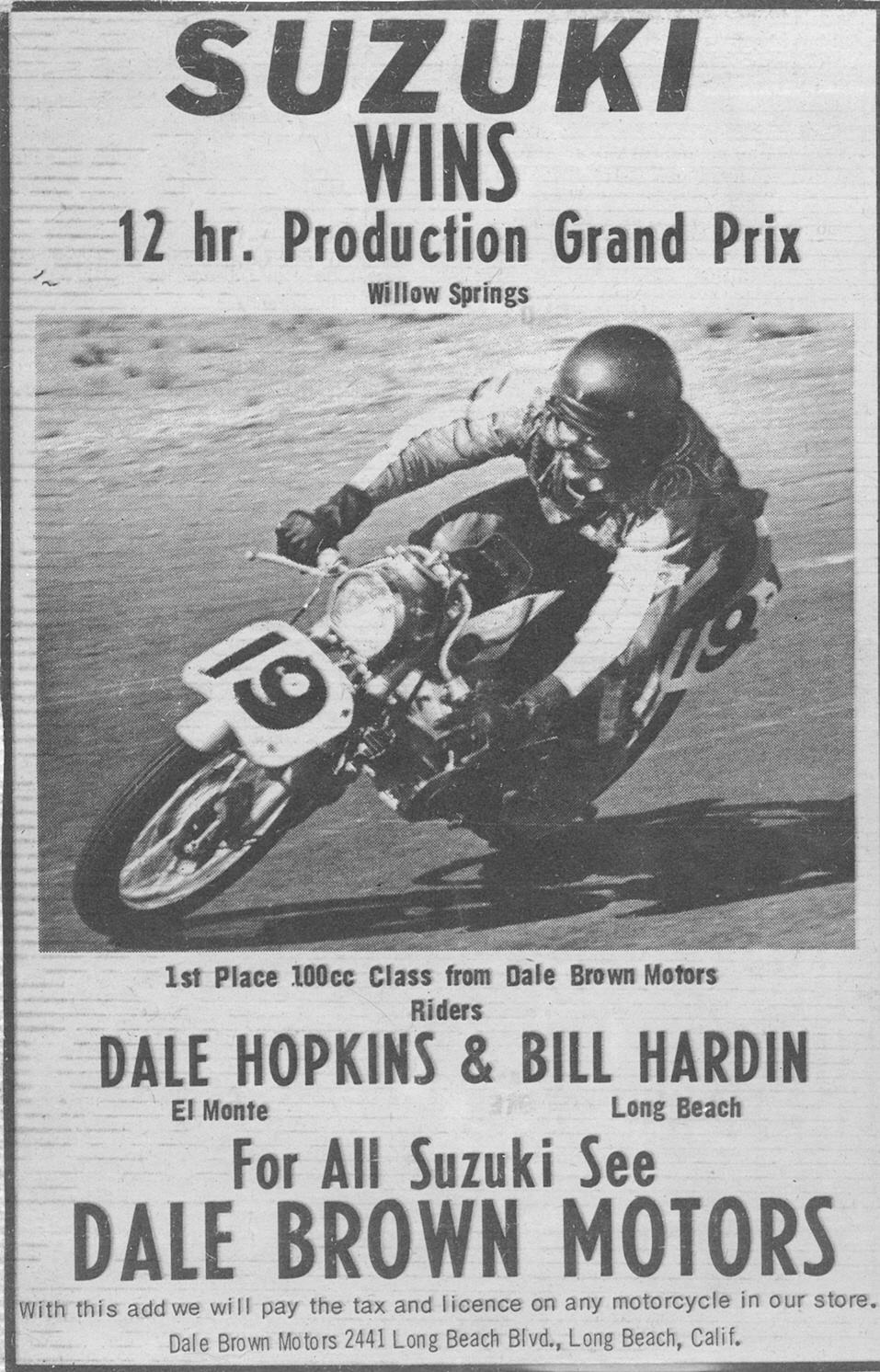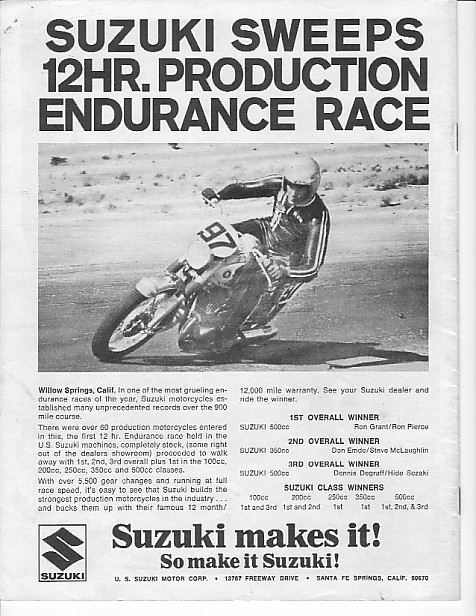 Ron Grant wins 1968 12 Hour Endurance Race, on a T500/5 (Suzuki Cobra), at Willow Springs