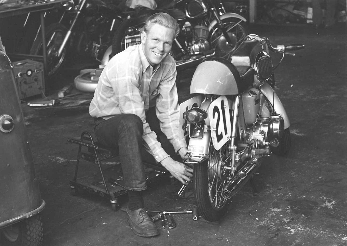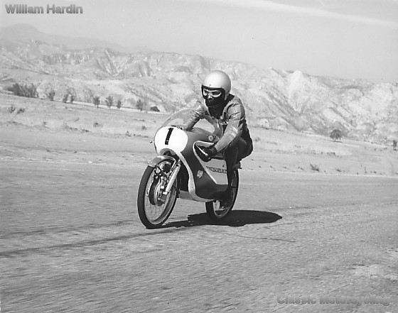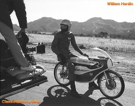 The road racer I am sitting on is a piece of world motorcycle history. It is the motorcycle that won the 50cc class at the Isle of Man in 1963 ridden by Mitsuo Itoh, the first Japanese rider to win on the Isle. I feel bad that during preparation for the commercial, I repainted the gas tank and fairing which took away from the authenticity of the motorcycle. It had been on display in the pagoda at the entrance to the national offices of U.S. Suzuki Motor Corporation in Santa Fe Springs California. The engine had twin rotary valves mounted on either side of the engine. I saw a photo of the crankshaft and it was being held in two hands tightly pressed one side against the other. The crankshaft barely over lapped the hands. The pistons were about the size of a U.S. quarter. A co-worker from U.S. Suzuki who I worked with at the time this picture was taken said that this bike is in the Suzuki museum in Hamamatsu.