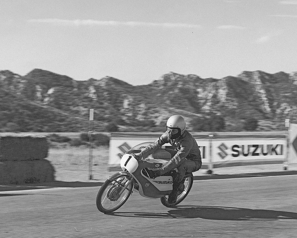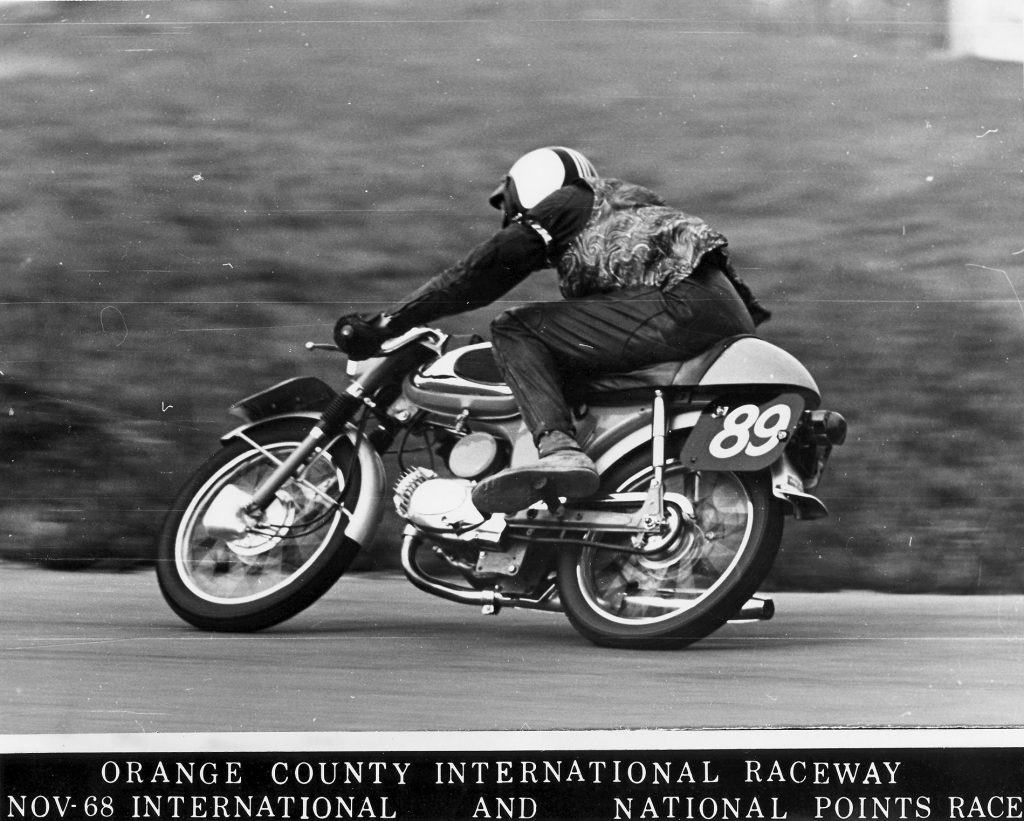 Isle of Man winning 50cc rotary valve twin 12 speed that M. Itoh rode. The paint scheme is not correct. It was beginging to look a little “Ratty”, so I painted it. They were taken at Indian Dunes Cycle Park in 1971 for a TV commercial. Ron had raced it at an Orange County club race and it was said that he looked like a spider on a fly when sitting up at the end of the front straight. You can see how small it is (I’m 6 feet 1 inch tall). Definitely designed for a Japanese rider!