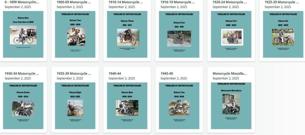 A rather large collection of PDF books on motorcycling history to browse online, courtesy of Dave Richmond, who continues to revise and update his motorcycle timeline on his website at motorcycletimeline.com. Generously, each volume in this monumental series can be viewed online. Please respect copyright.