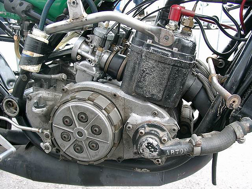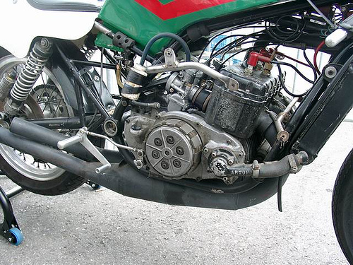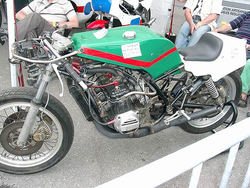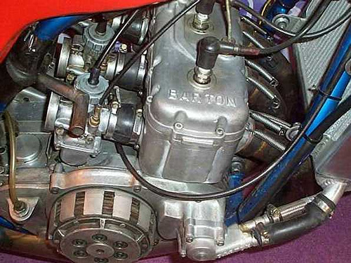 Here is a picture of a very rare racebike the Barton square four it is a 750 cc disc-valve water-cooled two-stroke. Barton used the design of the Suzuki RG500 engine but made it better and more reliable. Suzuki used Bartons design in later RG500 models. Two of these bikes were made by Barton, they wanted to race the bikes in the F750 class but that never took place. The bikes were used in the 1980 film Silver Dream Racer (see http://www.imdb.com/title/tt0081517/). They were ridden by Roger Marshall. After the film they were bought by Erik Buell, who still is the current owner. He was planning to race them in the AMA F1 class just before they banned them for this class.