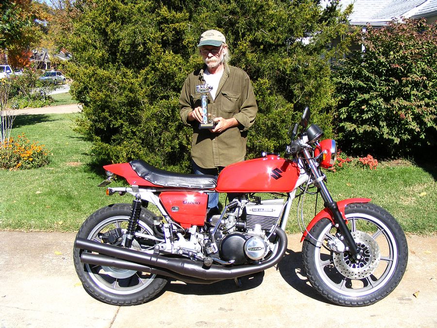 Coyote is the man...people's choice for his tidy GT550 Suzuki "Redzone", which started out to be a rat-bike but never quite got there.