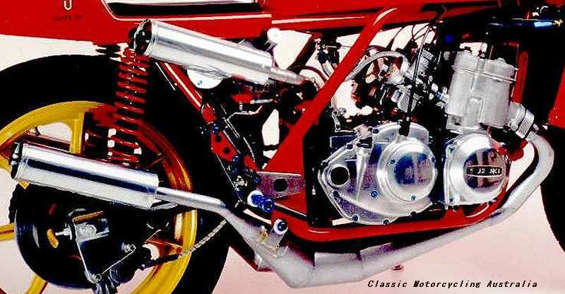 Seeley framed 750 Triple with a Barton engine (6speed) and a 1972 works cylinder barrel and head (the "illegal one"), Morris Wheels etc. The owner of this machine (and a lot of other very special two stroke Suzuki's - REIMO GTR900, Sparton 350 triple, 1972/73 XR11 etc.) was my close friend and former chairman of the Suzuki Wasserbüffel club ie. Thomas Wahle. Sadly he died in late 1998. The Seeley TR, was his special project and it won first prize at the Stafford Classic bike show for most technical interest. Karl is the chairman of the Suzuki Wasserbüffe club now (www.wasserbueffel-club.de)