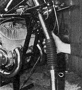 There is no way of bending fork stanchions straight and the only answer was renewal. However. there are some dealers who offer a fork-straightening service which may be used if the stanchions are not damaged too badly in the accident. With the wheels out, the mudguards front and rear were removed and Ernie''the hammer" Hall went to work gently tapping and shaping on a soft "former" surface (a block of wood) to avoid damaging the chrome. It worked a treat and. apart from a couple of barely visible marks. the mudguards are fully senriceable and almost as smart as new.