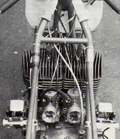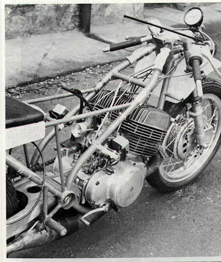 The new bike was built with the twin aims of a small frontal area and light weight. In this form it was able to use the lugging power of the 500 Suzuki motor to full effect and the machine was ideal for raod based circuits. The frame was built by Belletti in Milan from chrome-moly tubing and weighed only 6 kilos. The rear swingarm was rectangular and weighed 3.5 kilos. Output of the engine was 73 bhp. The tank held 25 litres and oil was held in the seat (1.5l). The brakes were Fontana items of course. The Jada probably represented the ultimate development of the air-cooled motor for its time. In 1973 the water-cooled 500 appeared on the tracks.